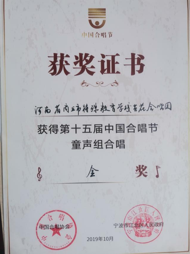 在师生的共同努力下,且多次邀请河南大学艺术学院院长陈家海给合唱团的孩子们进行指导,2019年10月,潘家贺与“苔花合唱团”参加第十五届中国合唱节比赛,并获得了此届合唱节童声组金奖。此后又获得了河南省第一届和第二届视障学生才艺大赛合唱一等奖、河南省教育系统庆祝新中国成立七十周年合唱比赛中小学生童声组一等奖等多项荣誉,合唱团多年的辛苦耕耘,终于慢慢迎来了收获。