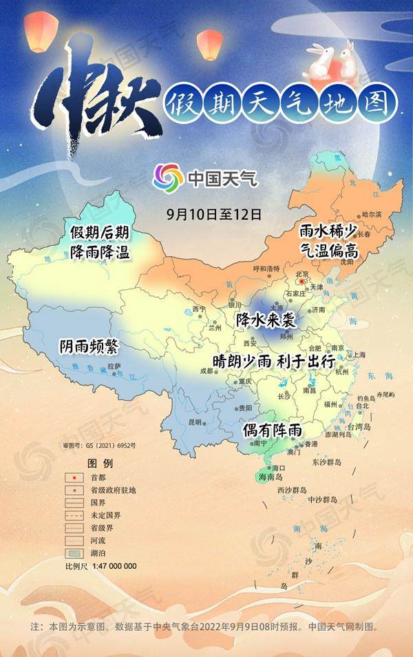中国天气网气象分析师王伟跃介绍,总体来说,今年中秋假期,我国中东部大部地区以及新疆南部、西北地区大部等地会延续晴朗少雨的天气格局,降雨将主要出现在西南地区大部、华南部分地区以及华北西南部到黄淮西部等地。