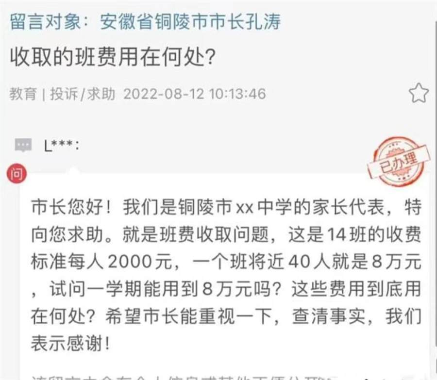 近日,安徽铜陵一学生家长在人民网领导留言板反映班费收取问题,该家长表示,孩子所在班级按照每人2000元的标准,一次性收取8万余元班费,家长质疑一个学期是否可以用到8万余元。铜陵市人民政府回应称,班级每人收费2000元情况属实。此项费用由家委会征得全体家长同意,代收代支,是为了方便家长,减少琐碎费用缴纳次数,集中一次性缴纳的班级代管经费。此项费用收支均不经过班主任及任课教师。(9月9日澎湃新闻)