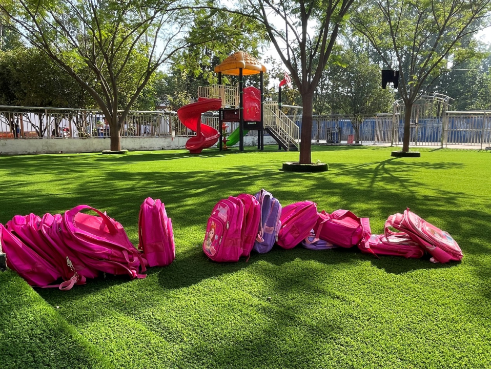 办公室前有一块新铺就的草坪,阳光从树叶的缝隙间溜出,在碧绿的草坪上显现出斑驳的倒影,崭新的粉色书包呈半圆状依次散开,角落里存放着一个个贴着姓名的小水杯。