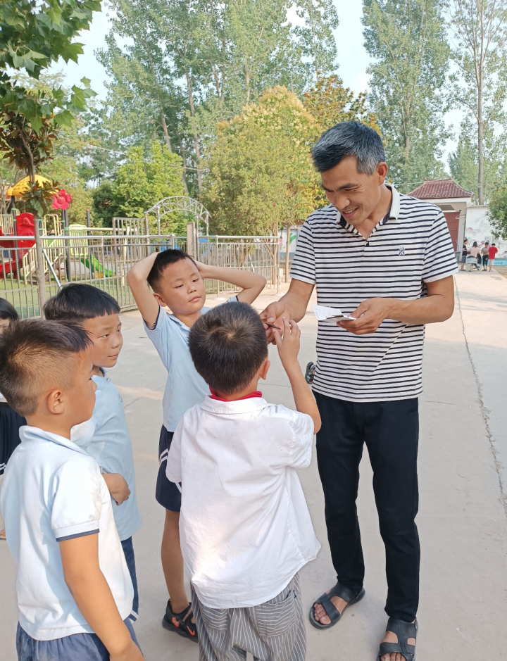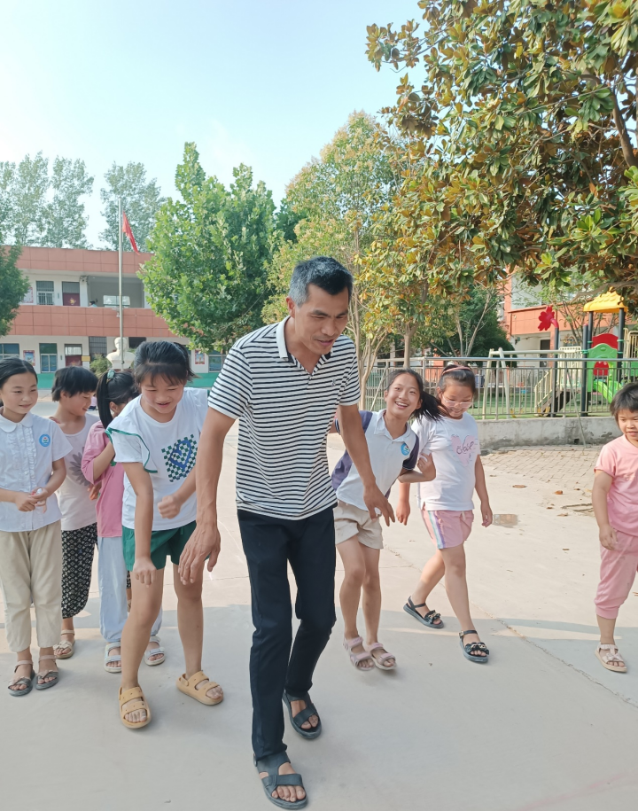 “校长爷爷,你这会儿有事吗?陪我们玩会儿吧!”孩子们一窝蜂似地围住他,拉着他一起做游戏。一位头发灰白、身形消瘦的“爷爷”映入眼帘,他就是校长张鹏程,在河南省太康县清集镇二郎庙小学,总能看到这样的场景。