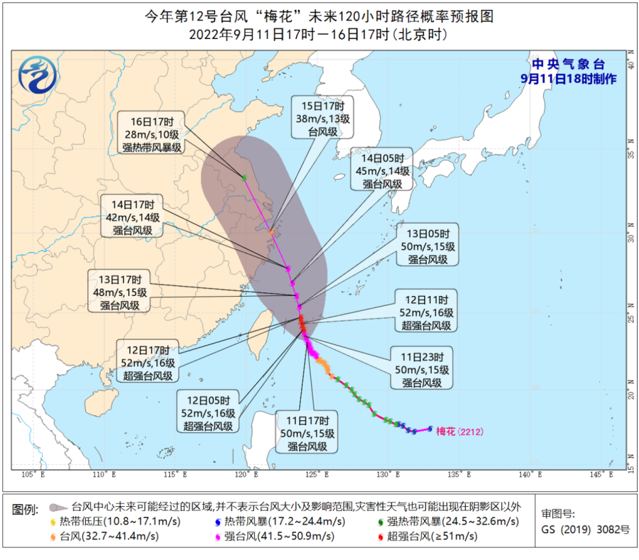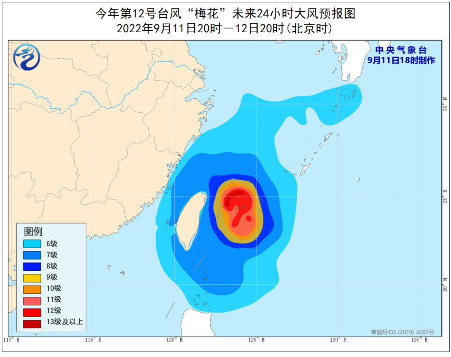 大风预报:9月11日20时至12日20时,东海中部和南部海面、台湾海峡、台湾以东洋面、巴士海峡、台湾省沿海、钓鱼岛附近海域有6—7级大风,阵风8—9级;东海东南部海域和台湾以东的部分海域有8—11级大风,“梅花”中心经过的附近海面和地区的风力有12—16级,阵风可达17级。