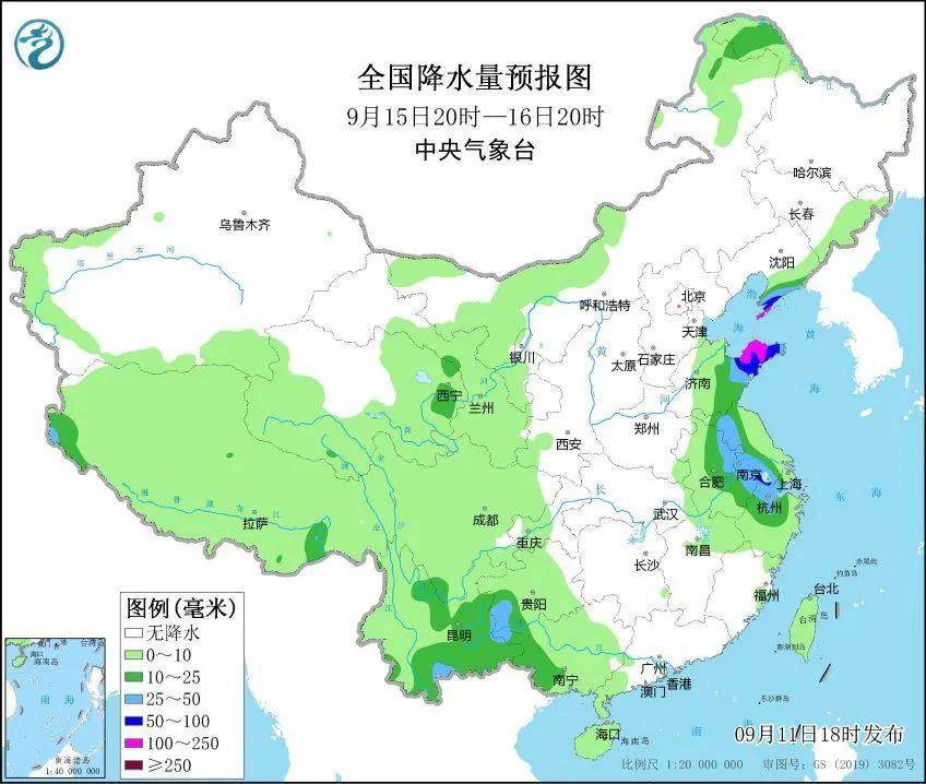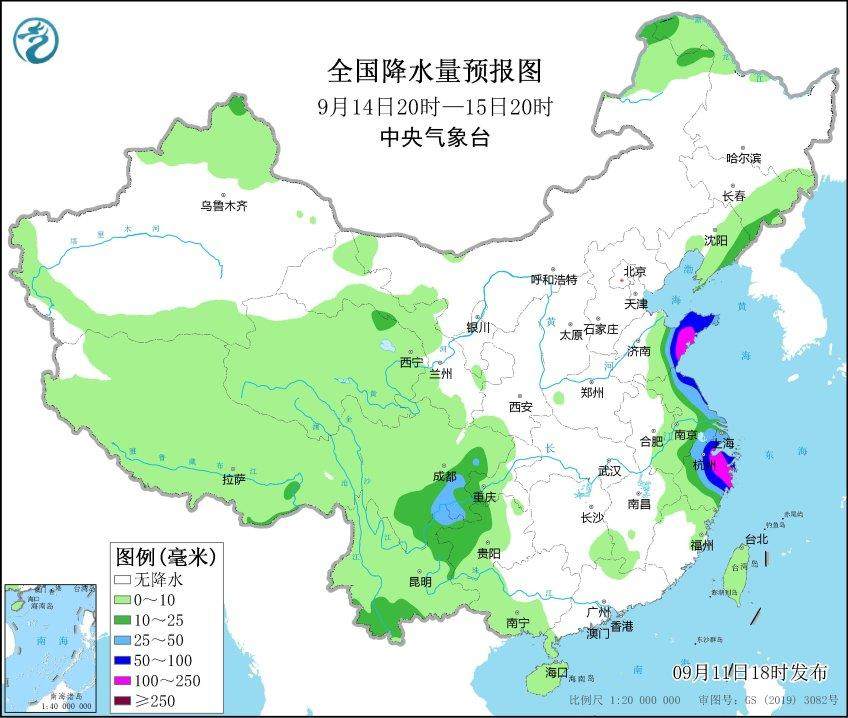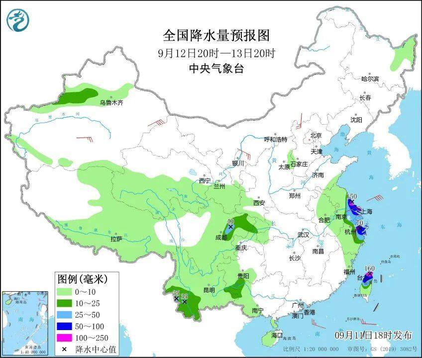 降水预报:9月11日20时至12日20时,江苏东南部、上海北部、浙江东部沿海、台湾岛北部等地有中到大雨,其中部分地区有暴雨或大暴雨(100—150毫米)。