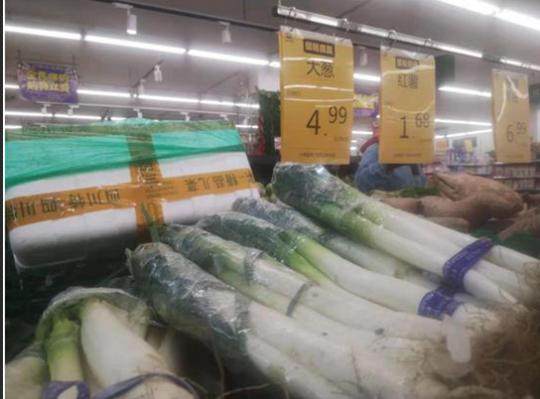 记者注意到,这家连锁超市的生姜分为精选和促销两种,精选生姜价格在15.80元/斤,品相较好,促销生姜价格6.99元/斤,姜面多有破损和水分,货架上也已所剩无几。大葱只有一种价格为4.99元/斤,存量充足,但是正在挑选的顾客认为大葱价格明显高了不少。