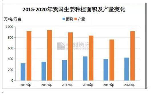 尽管近年生姜价格波动剧烈,但我国生姜种植面积总体呈现上升趋势。2015年生姜种植面积最低点为324万亩,2018年最高点为448万亩。到了2020年,生姜种植面积为428万亩,比2019年增长了6.73%。