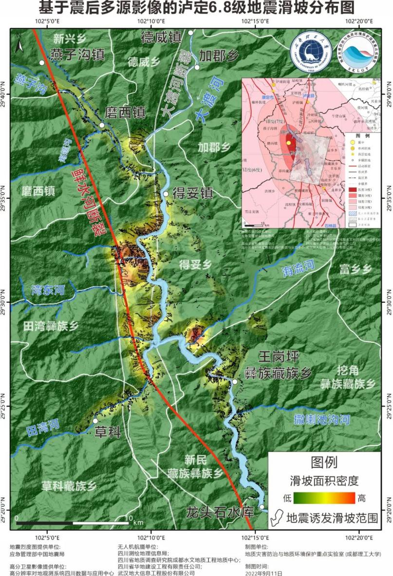 地震发生后,成都理工大学地质灾害防治与地质环境保护国家重点实验室强震地质灾害研究团队,利用前期已研发的地震诱发地质灾害预测模型,对本次泸定地震诱发地质灾害进行了预测。结果显示,受本次地震影响,震中东南地区地震诱发地质灾害概率最高。