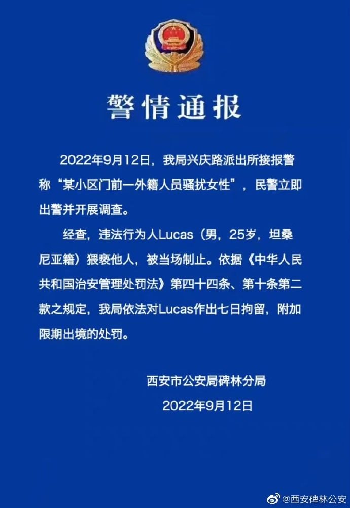 12日晚,@西安碑林公安警情通报:9月12日,我局兴庆路派出所接报警称“某小区门前一外籍人员骚扰女性”,民警立即出警并开展调查。