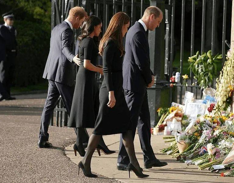 这两对夫妇身穿黑衣,一起走在温莎城堡的大路上,在场民众也报以热烈掌声。他们在温莎城堡外看着献给女王的花束,并分别在街道两旁与民众交谈、握手。