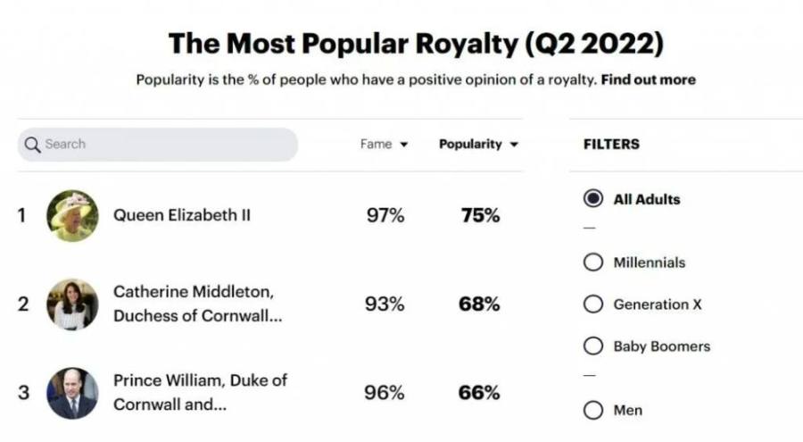 相比凯特的高人气,梅根在上一季度的民调中,受欢迎度排在倒数第二名。仅仅高于有“恋童癖”的安德鲁王子。