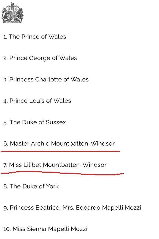 更尴尬的是,在查尔斯成为国王后,按理说她与哈里的孩子,应当直接成为王子、公主。但在白金汉宫发布的最新继承顺序上,哈里和梅根的孩子,没有被列为王子和公主。他们仍然被称为“Master”和“Miss”。