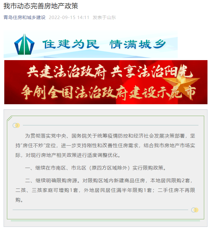 9月15日,“青岛住房和城乡建设”微信公众号发布《我市动态完善房地产政策》一文,为贯彻落实党中央、国务院关于统筹疫情防控和经济社会发展决策部署,坚持“房住不炒”定位,进一步支持刚性和改善性住房需求,结合青岛房地产市场实际,对现行房地产相关政策进行适度调整优化。