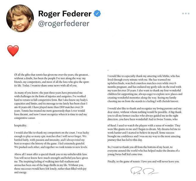 费德勒在社交媒体上表示,在过去三年的时间里,自己一直在同伤病作斗争。他一直以来都希望能够恢复自己的竞技状态,但是他自己知道身体的能力和极限,身体给他传递了非常明确的信息。自己已经年满41岁,在24年的时间里参加了超过1500场的比赛。网球对于他职业生涯的慷慨超乎想象,现在是时候结束自己的职业生涯了。