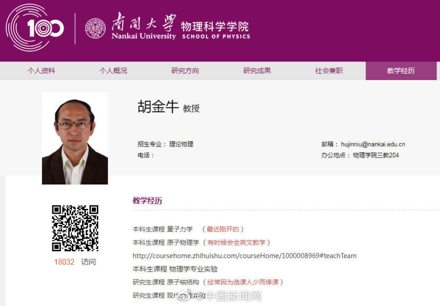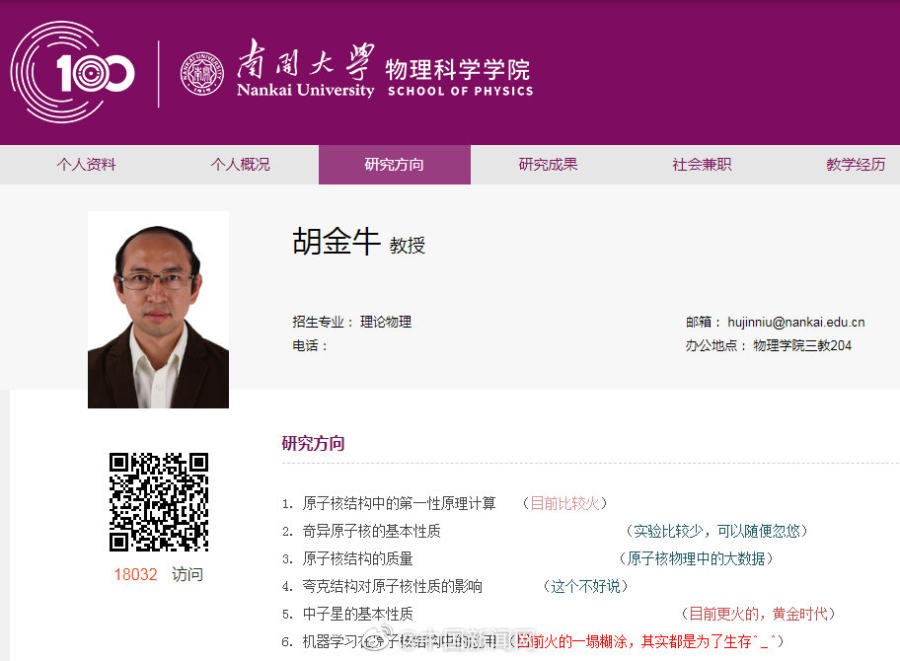 近日,网友发现南开大学物理学院教授胡金牛教授的简历有点意思:介绍自己的一长串学业研究经历,补充说明(主要是当时找不到工作);介绍自己发表论文的期刊,补充说明(被定义为水刊);介绍自己的教学课程,补充说明(常因为选课人少停课)……