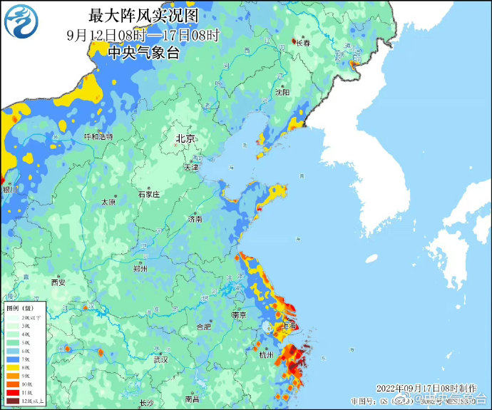 大风范围广,持续时间长。与冷空气结合,台风“梅花”带来的大风影响范围广、强度大、持续时间长。浙江东部、上海、江苏东部、山东半岛、辽宁东部等地最大阵风有8~10级,上海沿海、浙江沿海及部分岛礁12~15级,最大阵风出现在浙江舟山徐公岛16级(53.6米/秒)。浙江东北部沿海海面12级以上大风累计时长达12个小时。
