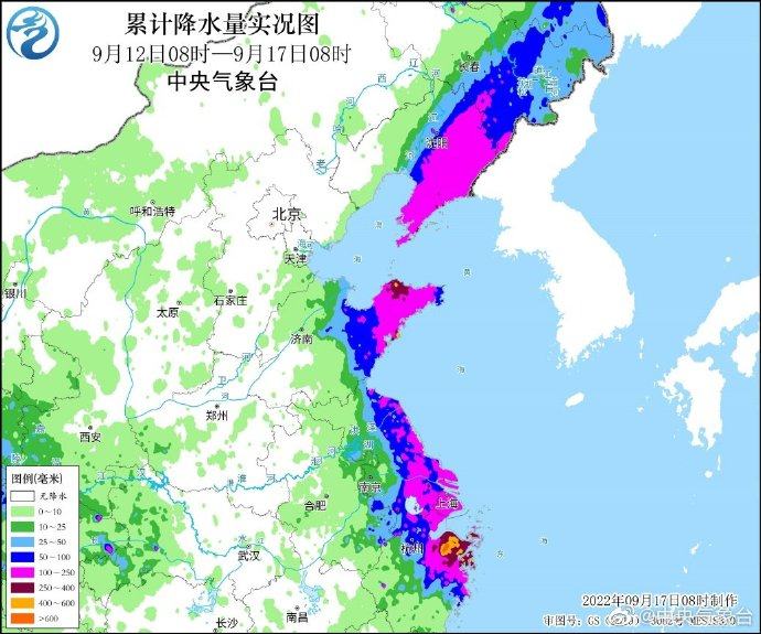 降雨强度大。浙江北部和东部、上海、江苏东部、山东半岛、辽宁东部及台湾岛北部等地累计降雨量有100~200毫米,其中浙江绍兴、宁波、舟山及山东青岛、烟台等地部分地区250~500毫米,绍兴上虞和嵊州、宁波余姚局地达600~707毫米。浙江(2个)、山东(8个)、辽宁(11个)、吉林(2个)共23个国家气象观测站日降雨量突破9月极值,山东福山日降雨量突破建站以来历史极值。