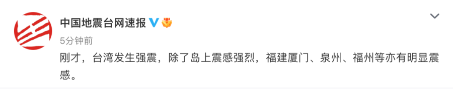据中国地震台网速报,刚才,台湾发生强震,除了岛上震感强烈,福建厦门、泉州、福州等亦有明显震感。