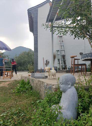 在村庄深处,一处民宿内,随处可见各种石雕、花草、画作,更为精妙的是房屋侧面的小花园。花园中安放了各种各样的石刻,漫步其中,抬头所见,即是青山,有诗情,有禅意,亦有乡愁。