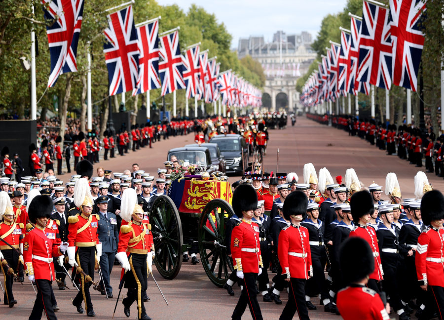 9月19日,在英国伦敦,载有英国女王伊丽莎白二世灵柩的灵车从白金汉宫附近经过。 新华社 图
