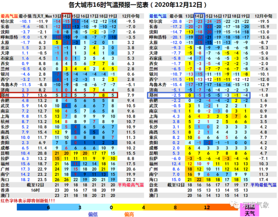 比如:省会郑州,14日最高气温2℃最低气温-5℃
