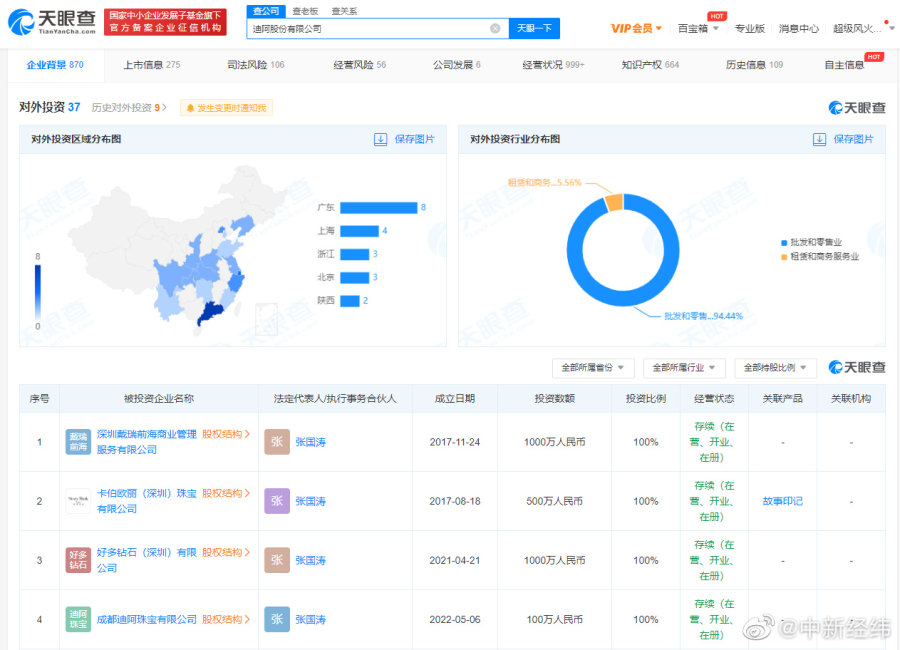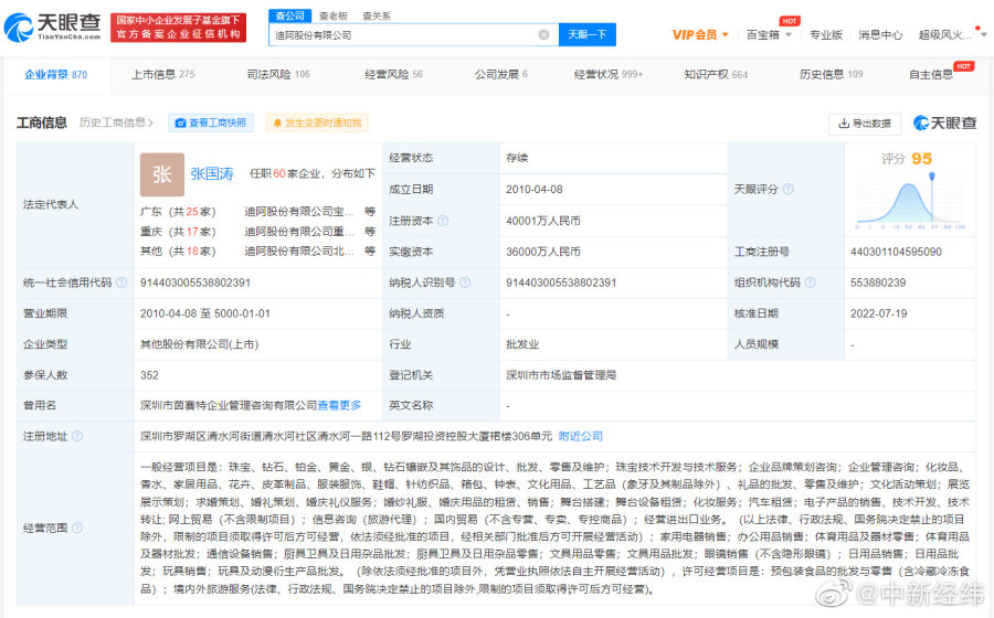 天眼查App显示,DR钻戒关联企业为迪阿股份有限公司,该公司成立于2010年4月,注册资本约4亿人民币,风险信息显示,该公司近日新增一条被执行人信息,执行标的48万余元,执行法院为郑州市金水区人民法院。该公司对外投资37家企业,均为存续、开业状态,包括上海玳瑞钻石有限公司、卡伯欧丽(深圳)珠宝有限公司等,投资领域涉及商业管理、钻石珠宝等。此外,该公司拥有640家分支机构,其中600余家为存续、开业状态。