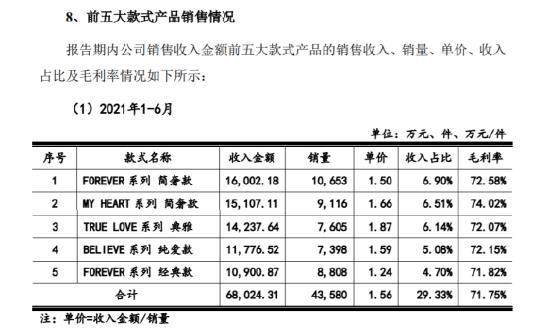 比如,其2021年上半年销量最高的FOREVER系列简奢款,成本仅为4000元左右,售价却高达1.5万元,毛利率超过72%。
