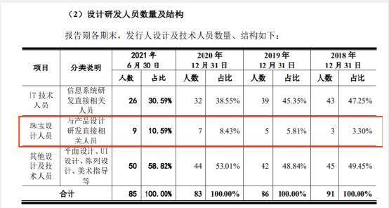 此外, DR在2021年的招股书中披露,DR公司主要从事珠宝首饰的研发设计、品牌运营和定制销售。但数据显示,2021年上半年,该公司的珠宝设计人员仅有9人,主要通过聘请外部设计团队研发、合作厂商选款等方式进行新品研发。2021年上半年,公司34个新增款式中,内部设计师设计的数量仅为2款,其余皆为合作厂商设计。