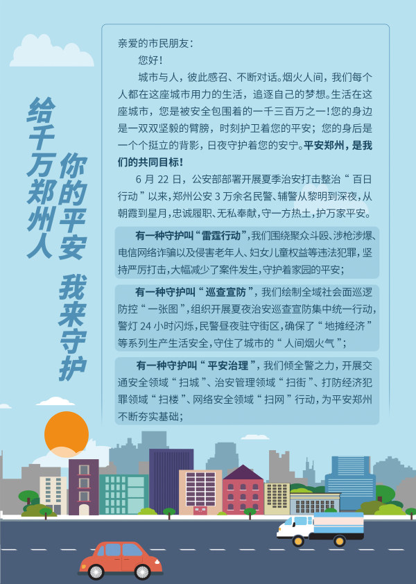 城市与人,彼此感召、不断对话。烟火人间,我们每个人都在这座城市用力的生活,追逐自己的梦想。生活在这座城市,您是被安全包围着的一千三百万之一!您的身边是一双双坚毅的臂膀,时刻护卫着您的平安;您的身后是一个个挺立的背影,日夜守护着您的安宁。平安郑州,是我们的共同目标!