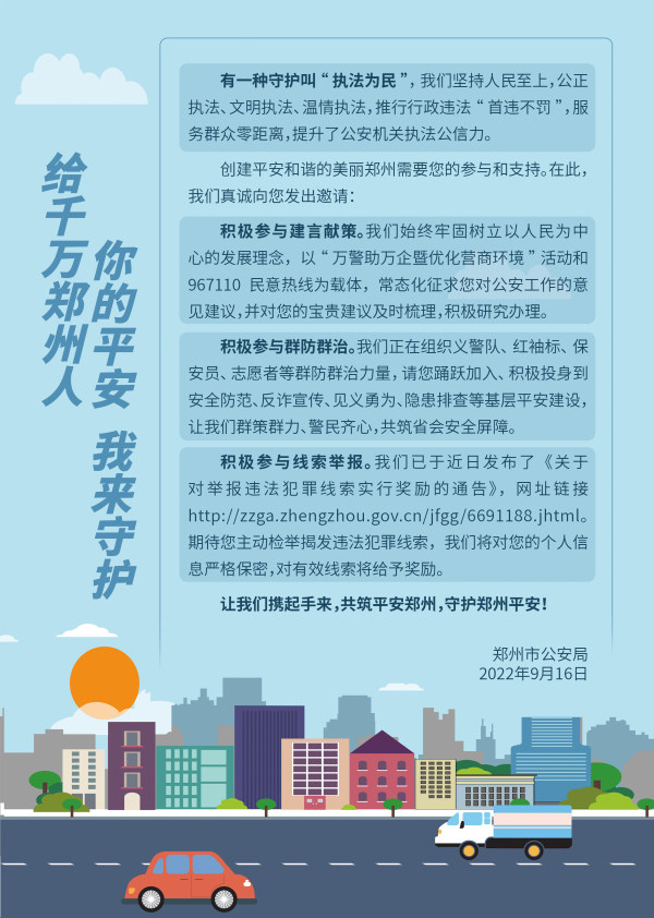 创建平安和谐的美丽郑州需要您的参与和支持。在此,我们真诚向您发出邀请: