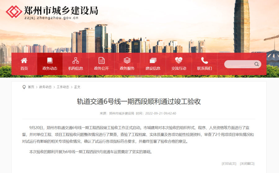 21日,据郑州市城乡建设局消息,9月20日,郑州市轨道交通6号线一期工程西段竣工验收工作正式启动。市城建局对本次验收的组织形式、程序、人员资格等方面进行了监督,并对单位工程、项目工程验收问题整改情况进行了复查,查验了工程档案、实体质量及各项功能性检测资料,审查了2个甩项项目审批情况和对试运行有影响的相关专项验收情况,确认了试运行各项指标符合要求,并最终签署了验收合格的意见。