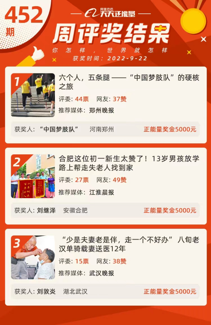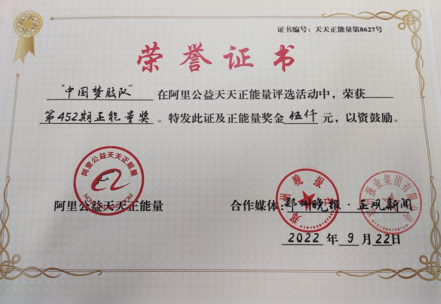 9月22日,经过正观新闻•郑州晚报的推荐,“中国梦肢队”荣获阿里巴巴天天正能量周评奖。