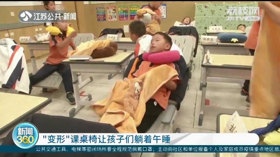 最近,南京外国语学校方山分校小学部专门为一年级学生配备了“神奇的课桌椅”,不仅可以根据小朋友的身高调节桌椅高度,还能完全放平,让同学们躺着享受舒适的午休时光。学生们只需要互相帮忙把椅子搬到桌旁,调整一下椅子靠背,再把椅子下面一块板子展开,铺上被褥摆上枕头,一张午睡的躺椅就完成了。(9月23日荔枝新闻)