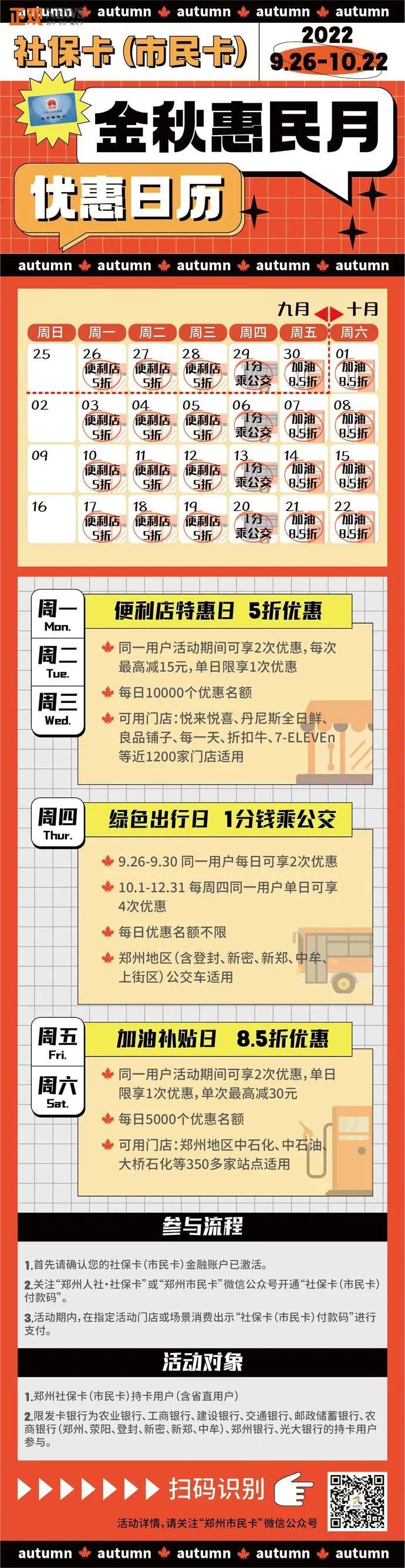 为了迎合大家金秋十月自驾近郊游的旺盛需求,每周五、周六使用“社保卡(市民卡)付款码”支付在郑州地区中国石化、中国石油、大桥石化的350多个指定站点加油,可享受“加油85折”优惠,单笔最高减30元,每人可享2次,单人单日可享1次优惠,活动期内总共40000个名额(每天5000个)。据悉,郑州社保卡(市民卡)持卡用户(含省直用户)且发卡银行为农业银行、工商银行、建设银行、交通银行、邮政储蓄银行、农商银行(郑州、荥阳、登封、新密、新郑、中牟)、郑州银行、光大银行的可参加本次活动。