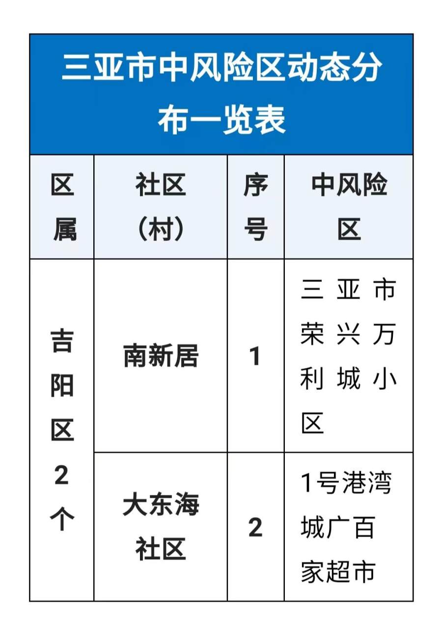 9月24日,记者从三亚市新型冠状病毒肺炎疫情防控工作指挥部获悉,根据当前三亚市疫情防控工作需要,按照国务院应对新型冠状病毒肺炎疫情联防联控机制综合组《新型冠状病毒肺炎防控方案(第九版)》相关规定,经专家组研判,三亚市疫情防控指挥部决定,将吉阳区南新居荣兴万利城小区等区域调整为中风险区。自通告发布起,中风险区调整为2个。除中风险区外的区域为低风险区。