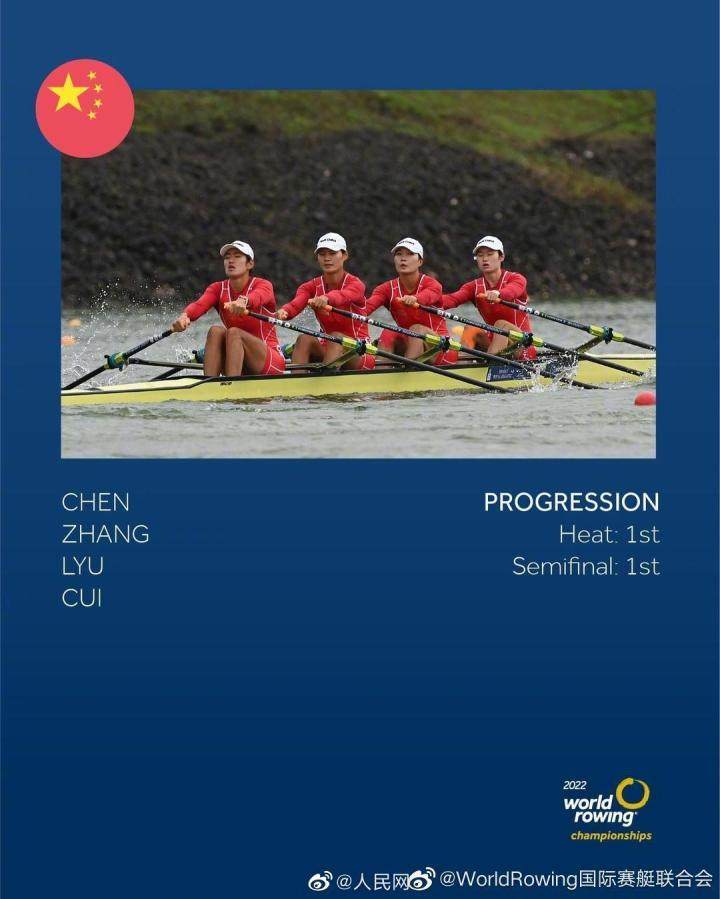 在北京时间9月24日晚进行的2022年世界赛艇锦标赛女子四人双桨决赛中,东京奥运冠军组合崔晓桐/吕扬/张灵/陈云霞再次联手出击,以6分17秒49的成绩强势夺冠,继2019年世锦赛后为中国队实现该项目的成功卫冕。