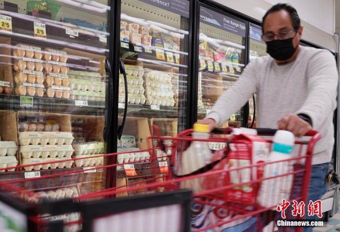 当地时间4月5日,一名顾客从美国加州圣马特奥县一家超市的鸡蛋货柜前经过。 中新社记者 刘关关 摄