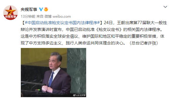 24日,王毅出席第77届联大一般性辩论并发表演讲时宣布,中国已启动批准《枪支议定书》的相关国内法律程序。这是中方积极落实全球安全倡议、维护国际和地区和平稳定的重要积极举措,体现了中方支持多边主义、践行人类命运共同体理念的决心。