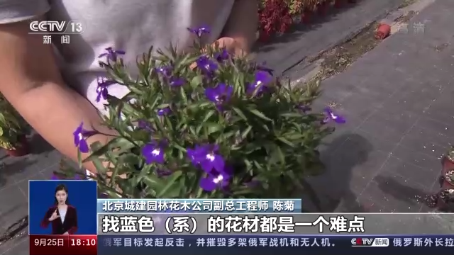 北京城建园林花木公司副总工程师 陈菊:皮实就是我们专业叫做适应性要好,国庆花卉整个的生长季全都在夏天,咱们夏天非常热,而且还雨热同期,不仅要耐热,而且还能够经得住狂风暴雨的这个袭击,所以它要足够的强壮、强大。另外,我们还会做一些有针对性的景观特色的这个要求。比如说,就拿我手里这盆蓝色系的花卉来说,在国庆找蓝色系的花材一直都是一个难点,因为大部分的蓝色系花都喜冷凉,在春天开花比较多。这两年,我们持续地在做,去筛选新的品种,通过栽培技术来解决这个问题。今年,在花坛里就可以呈现更多的蓝色系的花卉材料。