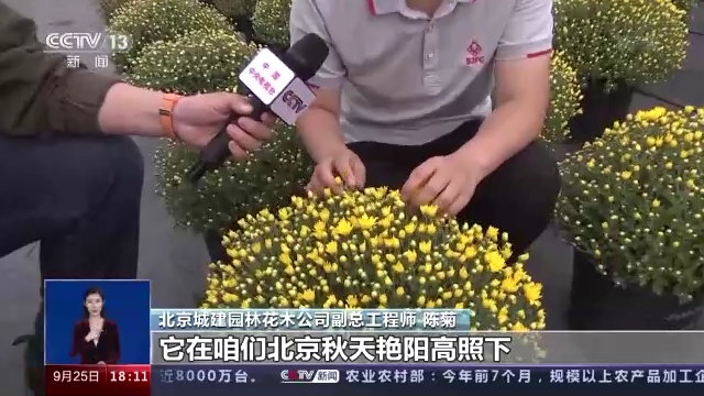 北京城建园林花木公司副总工程师 陈菊:这个品种是今年我们选出来的一个叫绚秋江月的品种,大家可以看到是一个亮黄色的品种,它在北京秋天的艳阳高照下,花色持久不褪色,一直到凋谢的状态。另外,它株型非常圆整,我们的育种目标是要选花期,可以维持三周以上的。这个品种它可以达到三周半的时间,所以从观赏性状上确实是一个很好的品种。从栽培特性上来讲,它扦插繁殖容易,种苗的一致性也都非常高。所以今年我们也是把它选出来,觉得可以作为国庆应用的一个新品种之一。