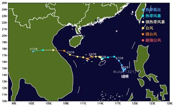 (1)台风“蝴蝶”2013年9月27日下午在南海中部偏东海域生成,自东向西穿过南海中部海面后登陆越南沿海(台风级)。其间,给我国南海和海南带来强风雨天气,造成海南14人死亡,48人失踪;越南因灾死亡14人、失踪2人。