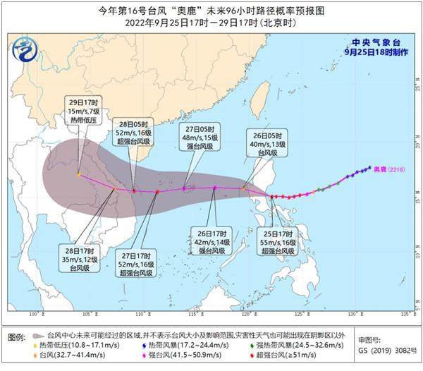 预计,“奥鹿”将以每小时25公里左右的速度向西偏北方向移动,将于今天晚上在菲律宾吕宋岛东部沿海登陆(48~55米/秒,15~16级,强台风级或超强台风级),今天夜间穿过吕宋岛,强度有所减弱,26日早晨到上午进入南海中东部海域,之后向偏西方向移动,逐渐向越南东部沿海靠近,强度还将有所加强,28日早晨到上午在越南东部沿海登陆(48~52米/秒,15~16级,强台风级或超强台风级),登陆后强度快速减弱。中央气象台9月25日上午发布台风蓝色预警。