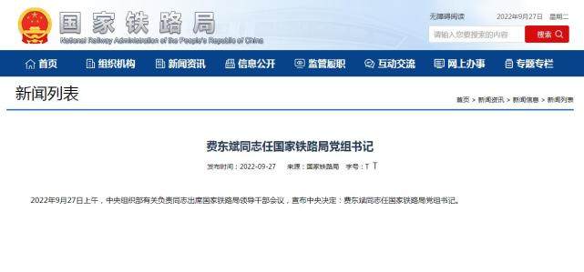据国家铁路局官网消息,2022年9月27日上午,中央组织部有关负责同志出席国家铁路局领导干部会议,宣布中央决定:费东斌同志任国家铁路局党组书记。