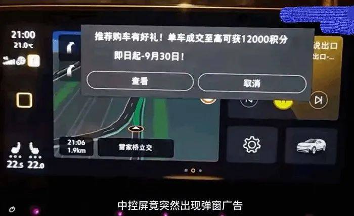 据报道,重庆的刘女士上周驾驶新买不久的一款纯电车,在使用车载导航行驶正途径一座立交桥时,中控触摸屏突然出现弹窗广告,内容为“推荐购车有好礼!单车成交至高可获12000积分,即日起至9月30日!”遮挡了导航信息。对此,车企相关负责人表示,车机消息推送是一汽大众面向车主的关怀行为,并非弹窗广告。主要内容是提醒用户保养、品牌活动邀约等与用户息息相关的信息。