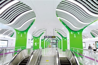 奥体中心站以“拱连群冠·民族和谐”为设计主题,通过柱与柱四方连续、塑造中部挑高的空间形体,柱间以花冠体现奥运精神,传递了体育魅力与城市活力。
