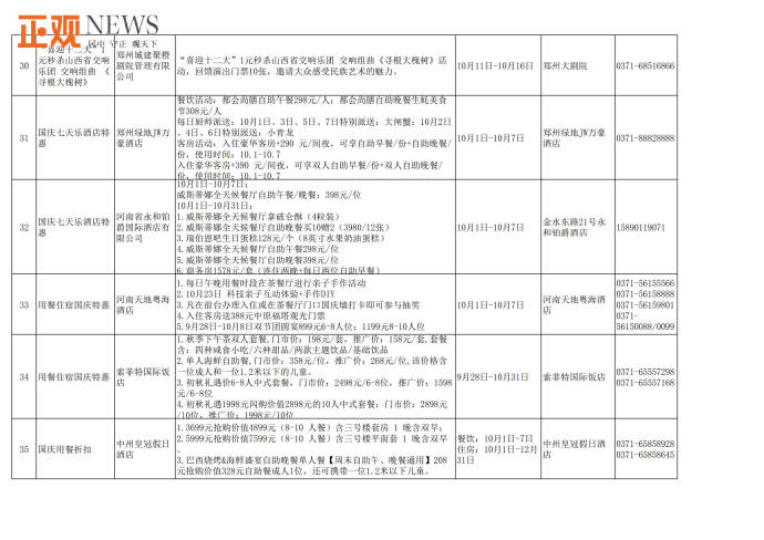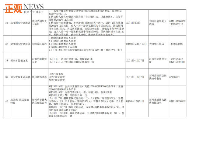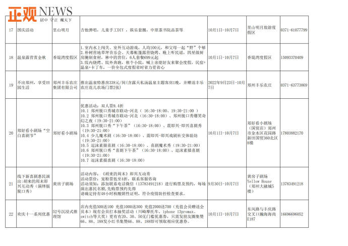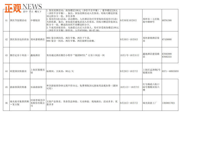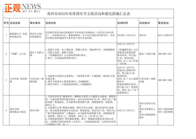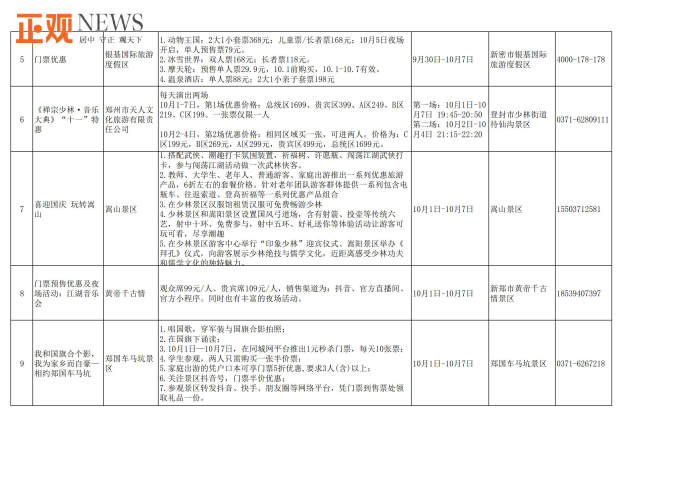 据了解,此次共推出文旅惠民措施90多项。包括“购旅游年卡·享政府补贴”活动,市民购买售价100元的旅游年卡可获补贴60元;建业电影小镇推出两大一小套票199元活动,《穿越德化街》12点场套票预售100元,只有河南·戏剧幻城推出国庆节夜场双人票预售390元,两大一小家庭套票590元,方特旅游度假区推出标准票280元,夜场票160元及两天一晚畅游套餐等;银基国际旅游度假区动物王国两大一小套票368元,冰雪世界双人票168元,长者118元等门票优惠活动;《禅宗少林·音乐大典》带来每天两场次的特惠票,第二场买一张票可进两人,嵩山景区推出“喜迎国庆、玩转嵩山”主题活动,租赁汉服可免费畅游,同时还有一系列国风武术表演和体验活动;郑州海洋馆推出抖音折扣价109元门票、每日前800名入馆游客获赠精美礼品、身份证上姓名含“国庆”字样的游客可享受0元购门票等优惠活动;黄帝千古情景区在抖音、官方直播间、官方小程序推出观众席99元/人、贵宾席109元/人门票优惠活动;郑好看小剧场、黄房子剧场、剧本杀推理馆等纷纷推出国庆节目展演、门票优惠、充值折扣等;绿地JW万豪酒店、永和铂爵酒店、中州皇冠假日酒店等推出自助餐及入住优惠活动。