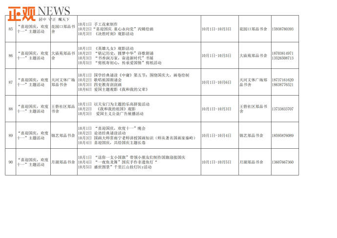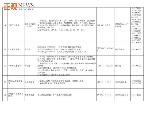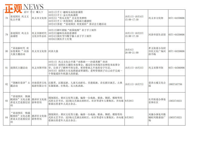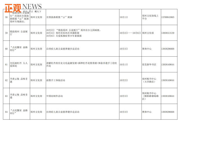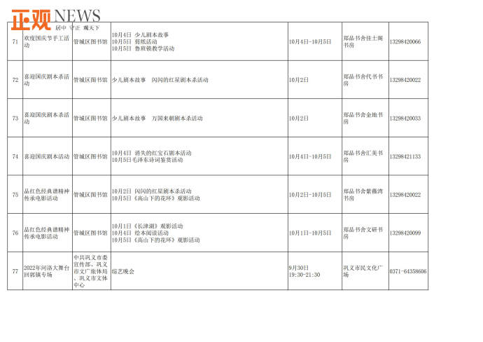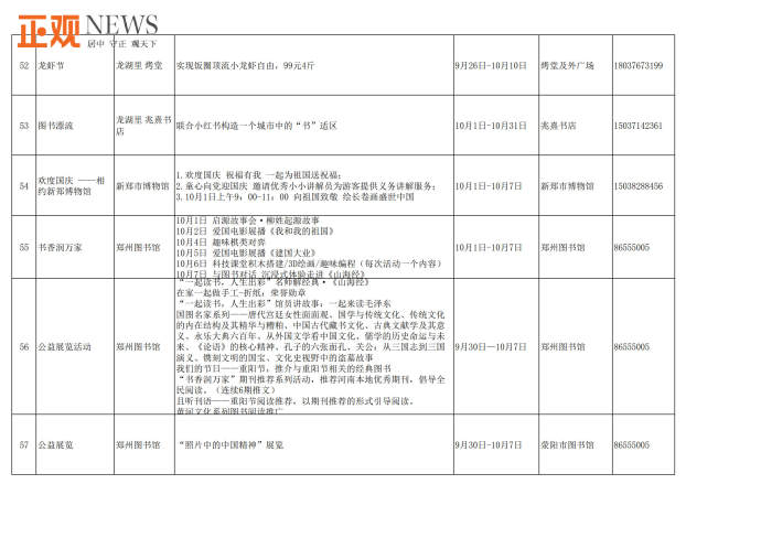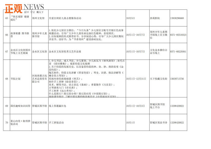 此外,不少文化场馆还将组织举办精彩的国庆主题活动和群众文化活动。郑州文化馆将举办中国结制作、“情韵郑州公益舞台”全国鼓曲联盟“云”展演等群众文化活动;郑州图书馆将线上线下同步举办“书香润万家,喜迎国庆”、名家系列讲座等文化活动;新郑博物馆将举办“欢度国庆祝福有我”、“童心向党迎国庆”等主题活动;巩义康百万庄园则推出康家蒙学堂沉浸式演出、新民乐国风摇滚夜等系列活动,并开启巩义市首届非物质文化遗产展示周,让游客近距离感受非遗之美;郑东新区海汇港美术馆、尚书房等单位将推出《万相丛林》国际潮流艺术展、“书香河南”阅读大会、《我和我的祖国》钢琴独奏会等表演和展览活动,龙湖里商业街开启国潮嘉年华水果品鉴节、hao市集、欢蟹节、龙虾节等艺术文创美食活动;里山明月旅游度假区推出吉他弹唱,儿童手工DIY,娱乐套圈等活动;惠济区荥泽古城文化公园推出“国潮在荥泽”主题活动,长兴街道及刘寨办事处等推出“喜迎国庆情满暖重阳”文化志愿者送文艺进基层活动;管城区、惠济区将在郑品书社城市书房举办“喜迎国庆,欢度十一”主题手工活动、国学经典诵读、爱国主题观影《长津湖》《我和我的祖国》等系列活动。