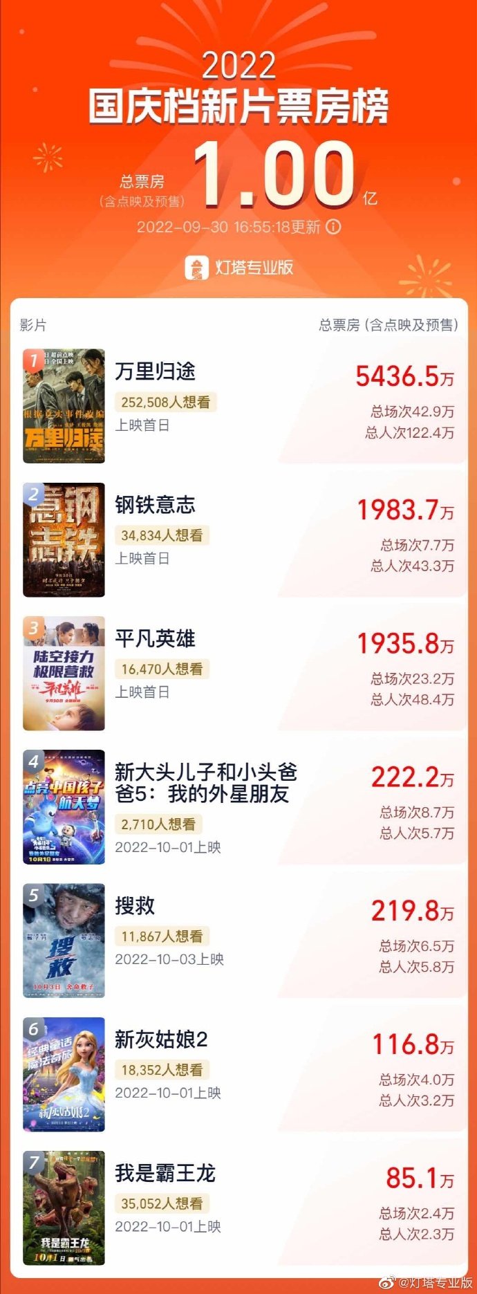 据灯塔专业版数据,截至9月30日16时55分,2022年国庆档新片总票房(含点映及预售)突破1亿,目前《万里归途》以票房超5400万(含点映及预售)领跑。