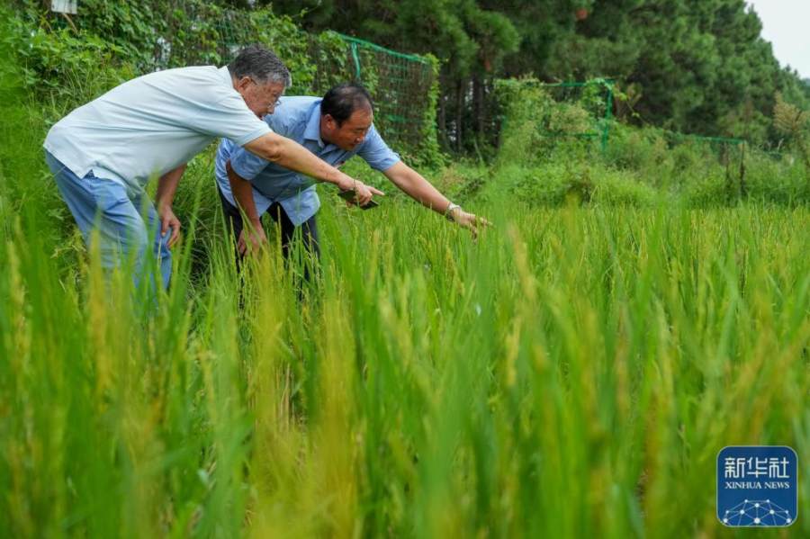 赵亚夫(左)在江苏省句容市天王镇戴庄村查看水稻长势(2022年9月9日摄)。新华社记者 李博 摄
