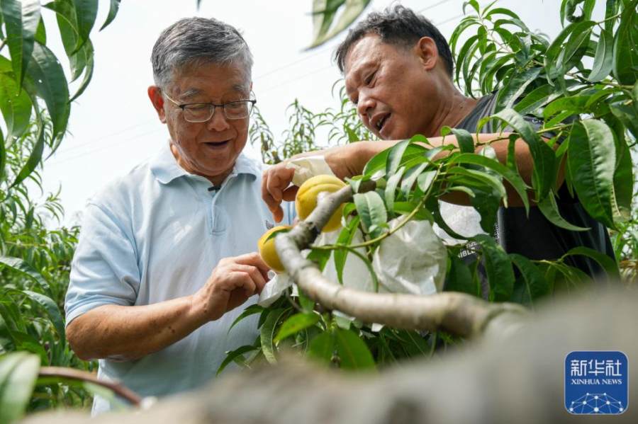 赵亚夫(左)在江苏省句容市天王镇戴庄村一处农业合作社查看果树生长情况(2022年9月9日摄)。新华社记者 李博 摄