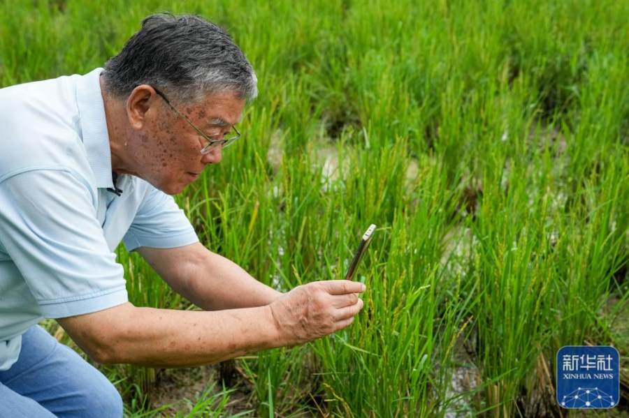 赵亚夫在江苏省句容市天王镇戴庄村查看水稻长势(2022年9月9日摄)。新华社记者 李博 摄