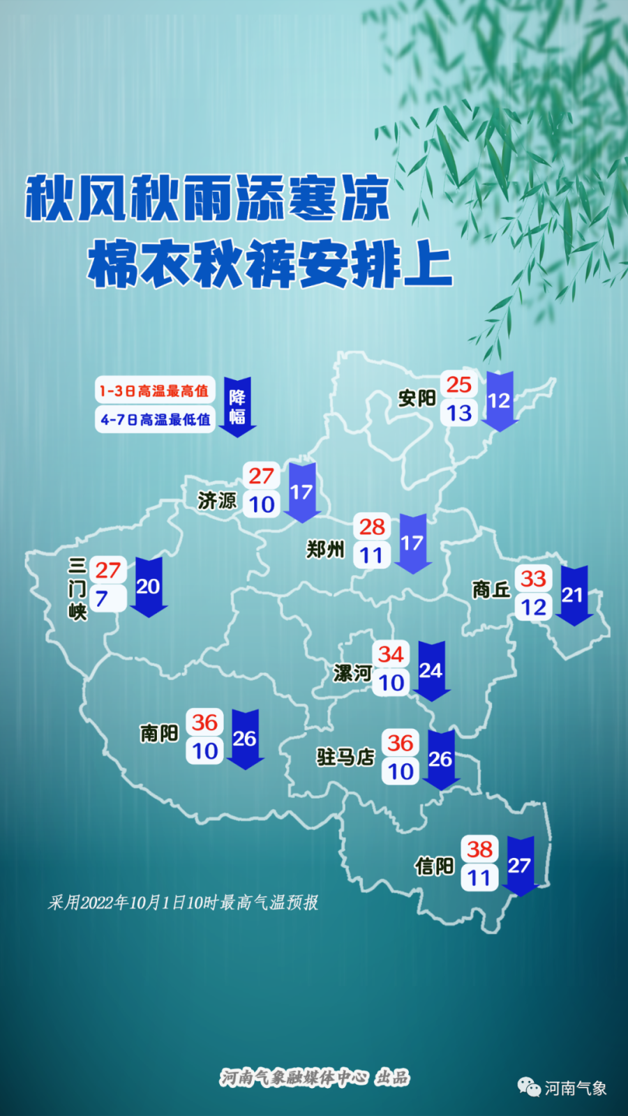 郑州1日下午到夜里,阴天有阵雨。偏北风2到3级。最高温度:25到26度;最低温度:21到22度。